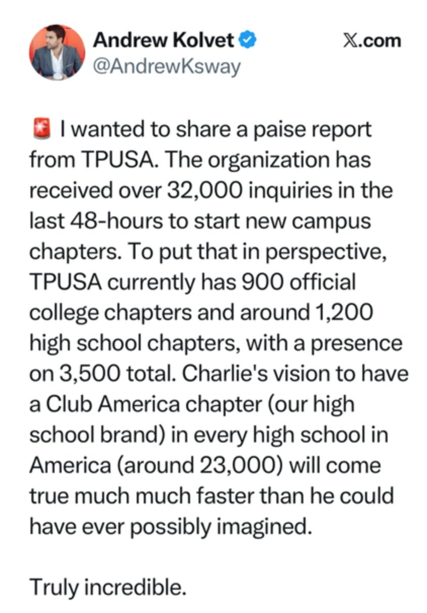 In addition to the surge in new Turning Point USA chapter requests, more than $4.6 million has been raised to support Kirk’s family through the Christian crowdfunding site, GiveSendGo.